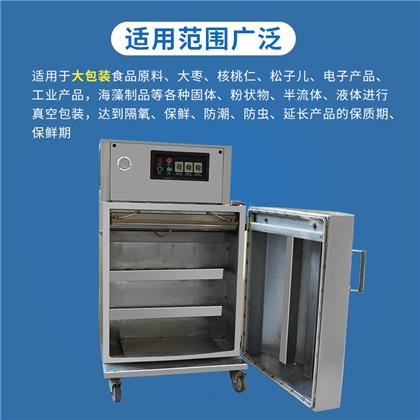 立柜式真空包裝機采用優良不銹鋼材料結構,主要用于粉末、顆粒、半流體或大包裝物體的真空包裝。該機型真空室容積大,袋口立封形式。可連同產品外包裝(如:箱、桶、盒)。直接擱置于真空室內,抽真空,封口,冷卻,放氣,全過程均可自動控制及完成。開門式的操作形式,便于重物擱置。(該型機可根據用戶特殊尺寸、配置要求定做)。